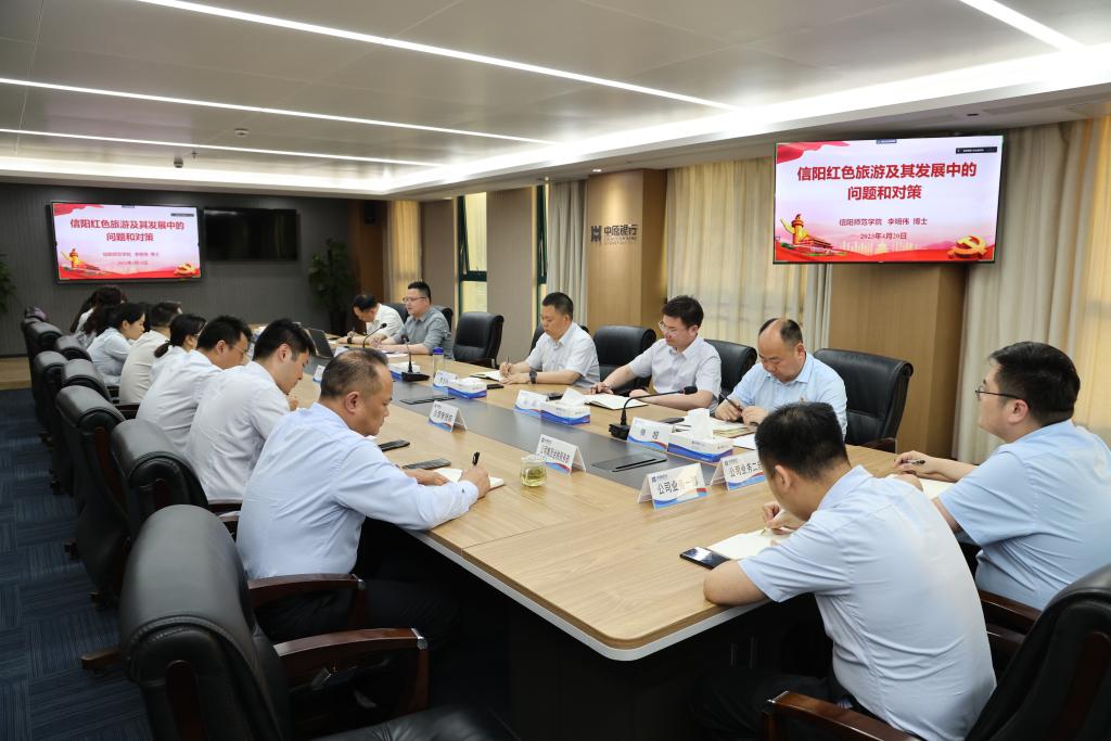 李明伟博士以“信阳红色旅游及其发展中的问题和对策”为题,从信阳红色旅游资源概述、种类与分布、开发利用成效、存在的问题及对策建议等四个方面对信阳市红色旅游现状作了详细报告。报告内容丰富、贴近实际,赢得与会同志广泛互动。会后,中原银行的与会同志纷纷表示,要把开展主题教育与推动具体工作相结合,在主动担当作为和融入服务区域发展上下真功,在对接服务信阳红色旅游资源开发中做出新努力,争做信阳红色旅游资源开发利用的助力者。