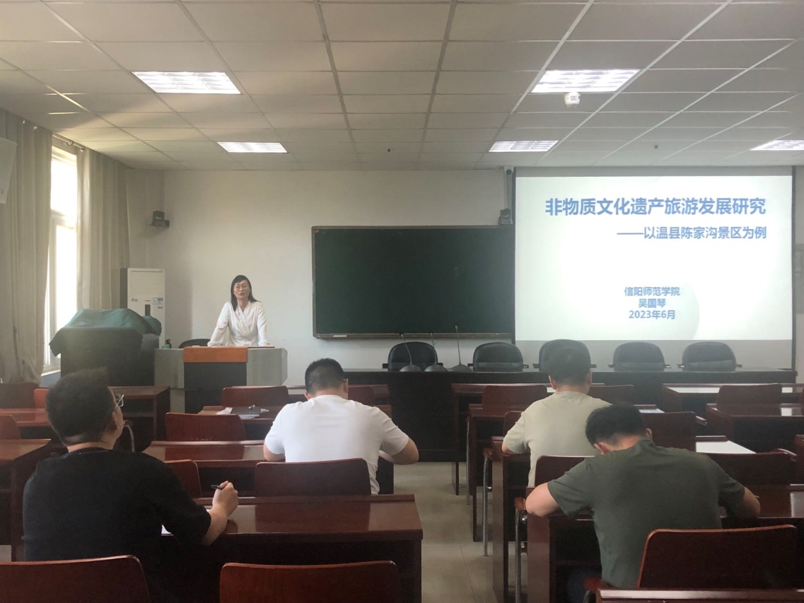 6月6日下午,XC体育第十二期“景明论坛”在经管楼401会议室成功举办。XC体育吴国琴教授作了题为“非物质文化遗产旅游发展研究——以温县陈家沟景区为例”的学术报告,XC体育部分师生聆听了报告。