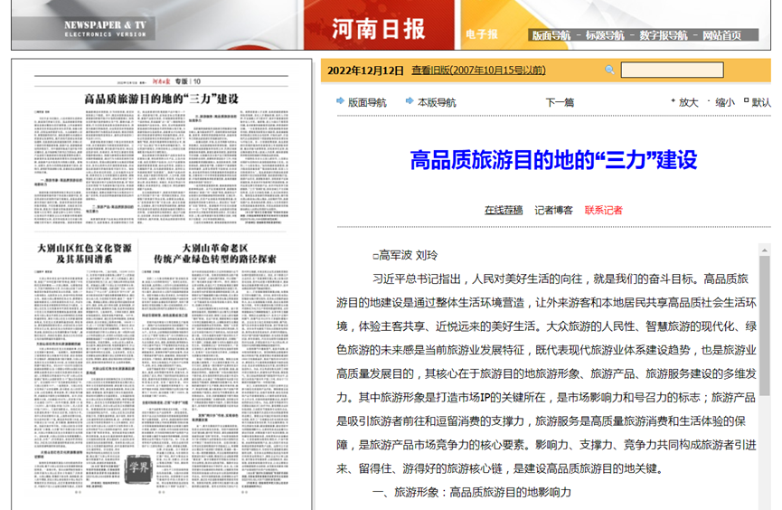 公司高军波教授、刘玲博士分别在《中国旅游报》和《河南日报》上发表理论文章。《用平台思维构筑民宿行业共利共赢生态圈》发表在中国旅游报2022年9月14日第4版,《高品质旅游目的地的“三力”建设》发表于该河南日报2022年12月12日第10版。