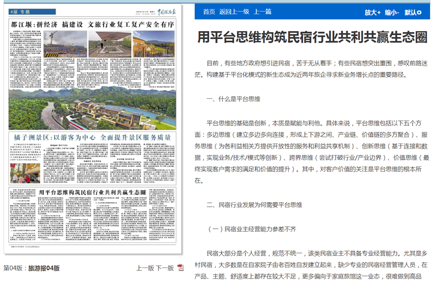 《用平台思维构筑民宿行业共利共赢生态圈》一文指出,构建基于平台化模式的新生态成为近两年旅游企业寻求新业务增长点的重要路径,并在深刻论述民宿行业发展为何需要平台思维后,分别从品牌流量加持、专业技术支持、行业人才输出、物资一站式采购和OTA精细化管理五个层面提出平台思维赋能民宿行业发展路径。