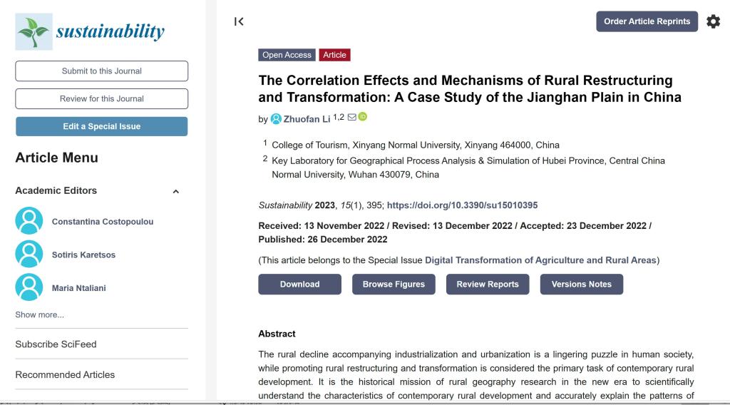 XC体育李卓凡博士在SSCI期刊《sustainability》(2022年影响因子:3.889)上发表题为“The Correlation Effects and Mechanisms of Rural Restructuring and Transformation: A Case Study of the Jianghan Plain in China”的学术论文。