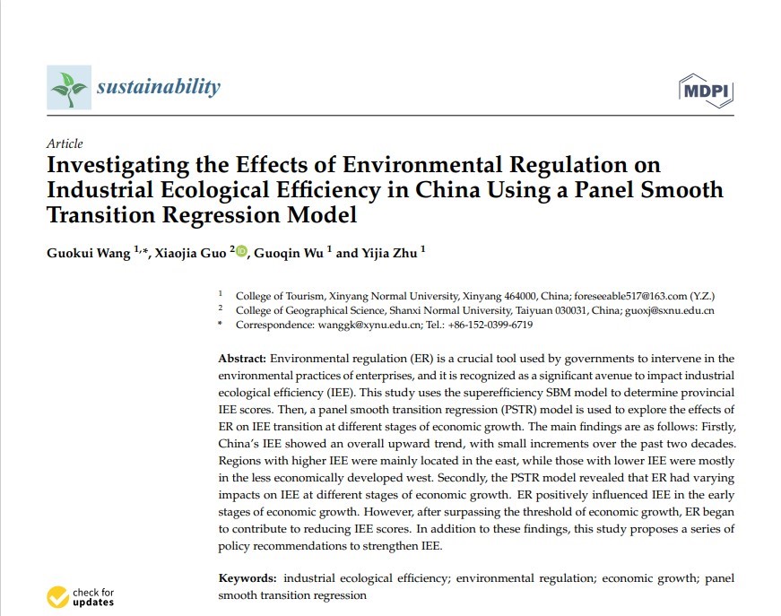 XC体育王国奎博士在SSCI期刊《sustainability》上发表题为“Investigating the Effects of Environmental Regulation on Industrial Ecological Efficiency in China Using a Panel Smooth Transition Regression Model”的学术论文。