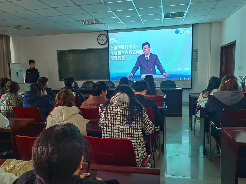 为推动涉台教育机关活动进一步深化,提高员工对中央对台方针政策的认识,11月17日下午15时,XC体育专职组织员王亚文组织部分员工在经管楼401室收看了全国台湾研究会理事郑剑教授的正确把握和平统一和非和平方式的辩证关系专题讲座。