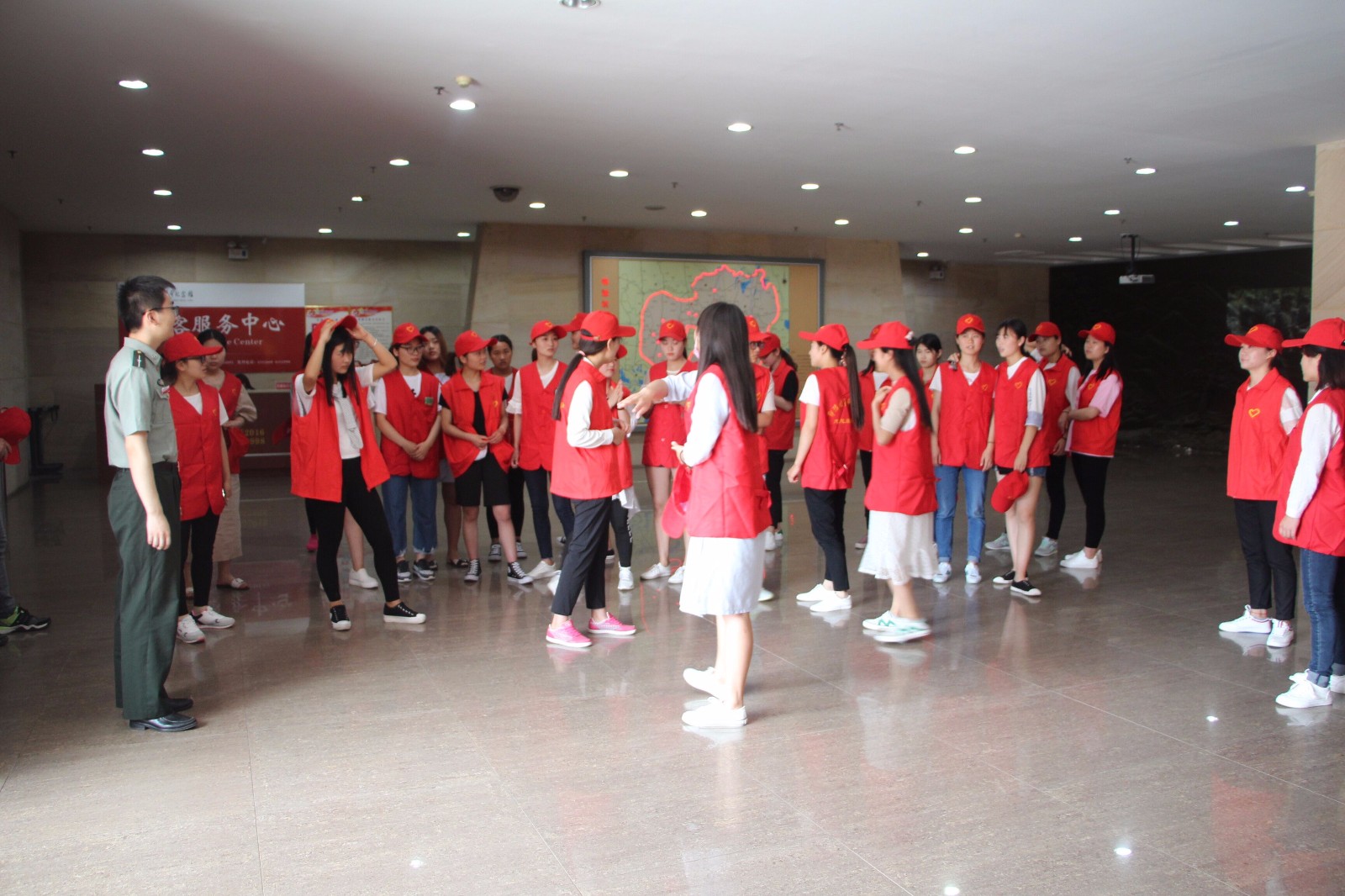 活动共分为鄂豫皖革命纪念馆志愿服务、旅游知识讲解及微博三个主题。5月19日,公司积极组织员工代表赴鄂豫皖革命纪念馆参与馆内的志愿服务活动。36名学子参加此次志愿服务队。志愿者步行至鄂豫皖革命纪念馆前进行集合,每人穿戴了红色志愿服及志愿帽并组织有序的进入馆内。随后在馆内工作人员的指导和协调下,志愿者根据志愿活动内容每人坚守七个展厅的各个陈列台前、门口或危险地方,负责馆内不文明行为的制止和范围内对游客行为的帮助提醒。天气炎热,参观人员的增加并没有使志愿者放弃,她们依旧认真坚守自己的职责,为参观群众开门问候,微笑回答提醒游客的各种疑问行为。最终同学们的志愿服务活动得到了馆内工作人员和众多游客的一致好评,对信阳红色文化的传播起到了很好的效果。