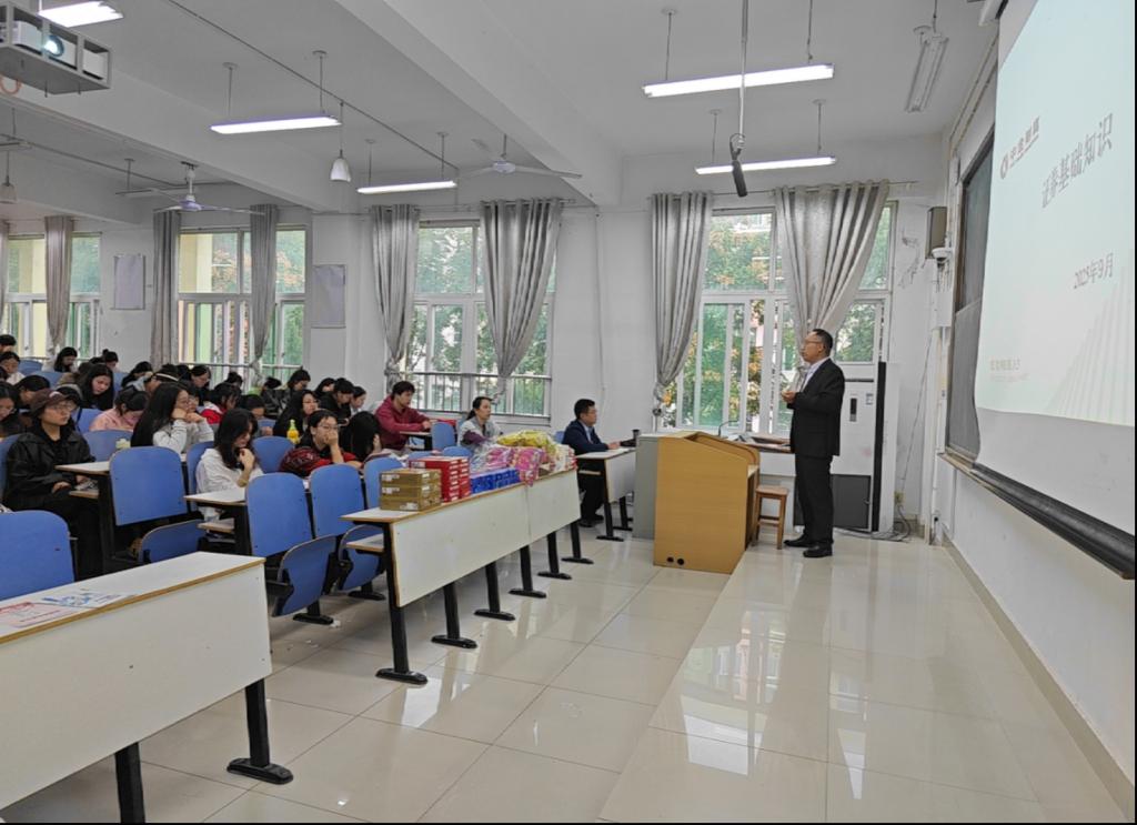 宣讲会现场,XC体育政法公司优秀员工陈原率先开讲,为同学们系统讲解金融领域基础知识,构建起金融知识学习的入门框架。随后,余海洋围绕证券、股票基础知识及核心术语展开深入解读,助力学子们破除证券知识认知壁垒。中金财富证券投资顾问张克结合实践经验,分享证券投资思路与风险防控要点,引导员工树立理性投资观念。最后,陈原聚焦证券行业职业规划,详细解读求职要点、晋升空间及券商未来发展趋势。并强调职业选择需关注企业“企业文化、战略方向”与团队“团队氛围、领导风格”两大核心因素,并鼓励毕业生以赛促学,深化金融知识应用能力。