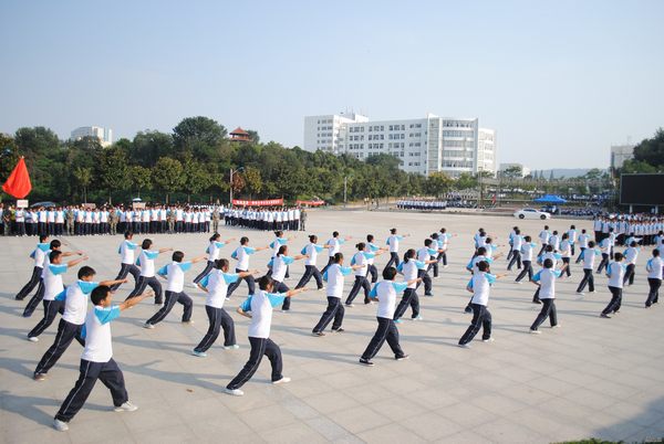一招一式虎虎生威,众人齐动声振寰宇。9月20日下午,信阳师院2013级军体拳比赛精彩亮相,参加比赛的19个院系的21支代表队齐聚信阳师院体育馆前的青年广场上,展开了一场激烈角逐,工商管理公司市场营销班,工商管理班和会计学二班参加了比赛。该校相关职能部门负责人和部队首长出席比赛并担任评委,检验了近期的军训成果。