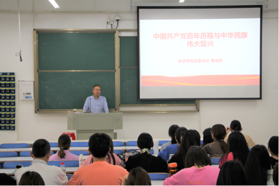 为深入开展党史学习教育,5月13日, 旅游公司党委书记曹明贵在社科楼215以《中国共产党的百年历程与中华民族伟大复兴》为题开展专题党课,2019级旅游管理3班和酒店管理班全体员工参于此次会议。