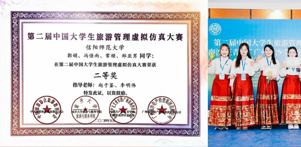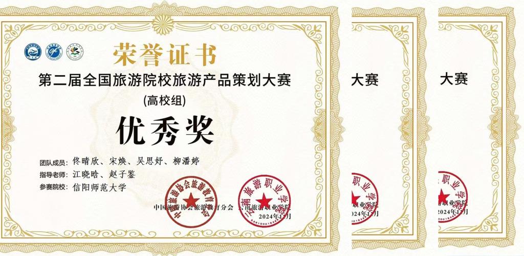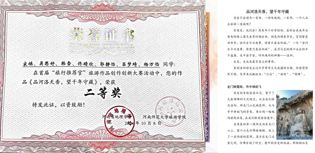 2024年9月,在河南省地理学会、河南师范大学联合举办的首届全国老员工“旅行推荐官”旅游作品创新大赛中,由XC体育教师赵子鉴指导的宋焕团队(吴思妤、韩雪、佟晴欣、郭静怡、吕梦琦、杨万怡)作品《品河洛天香,望千年守藏》荣获二等奖。